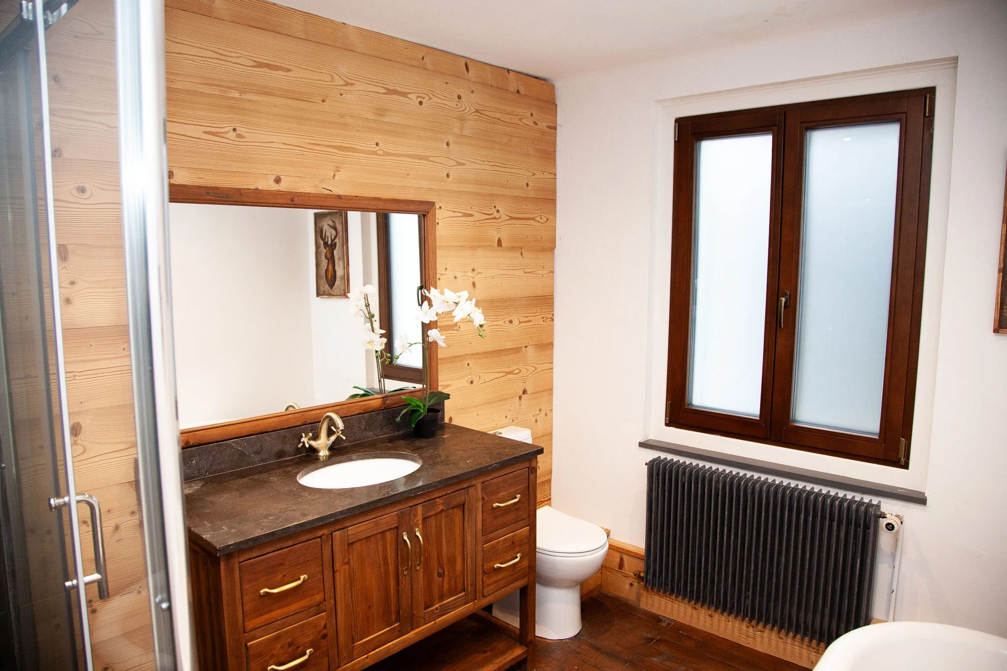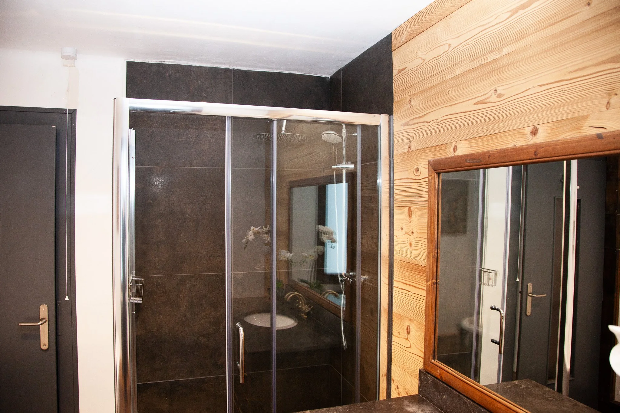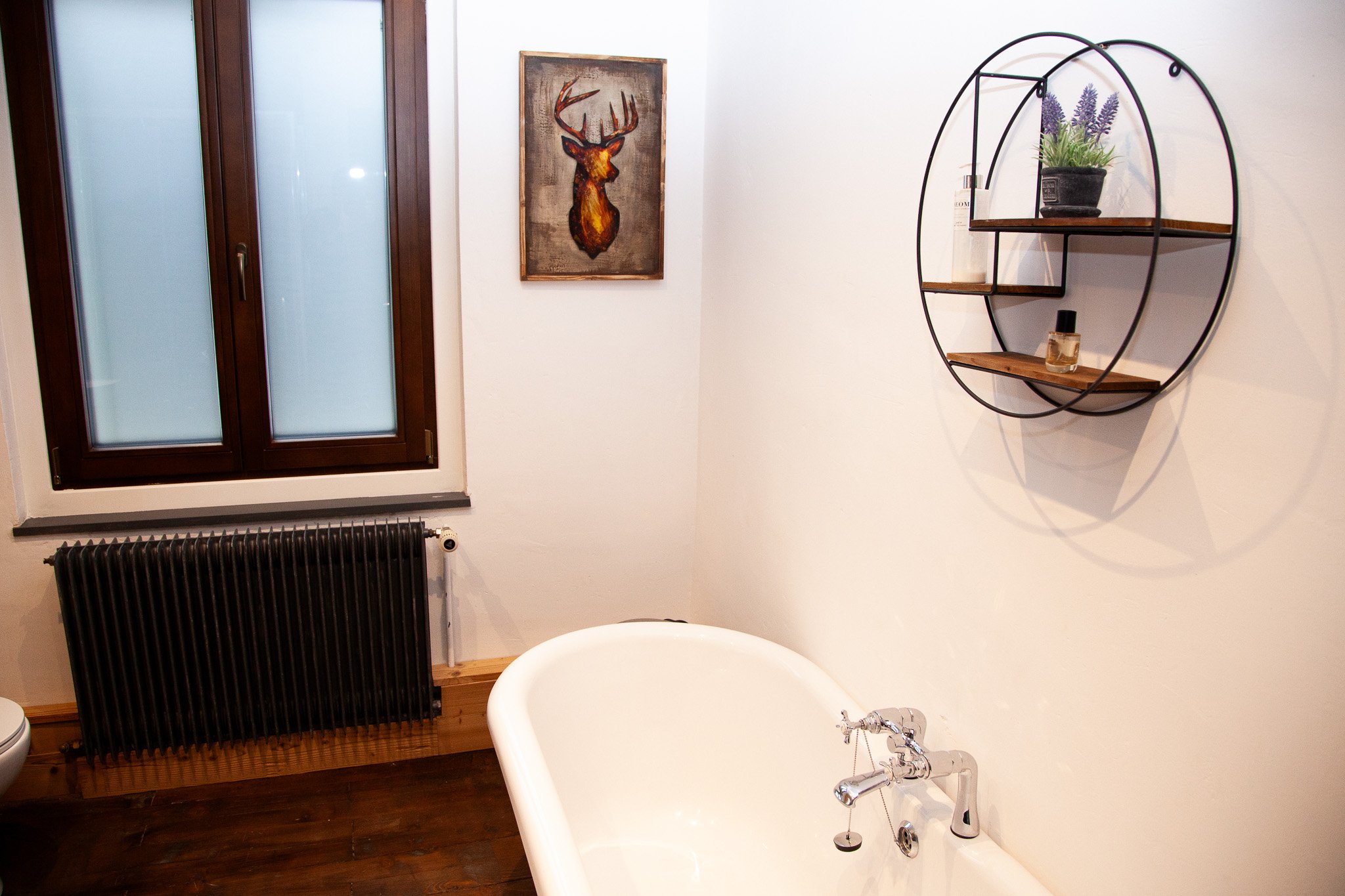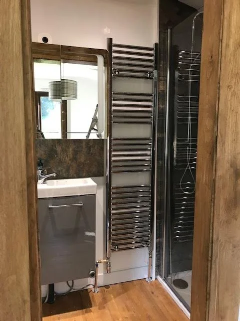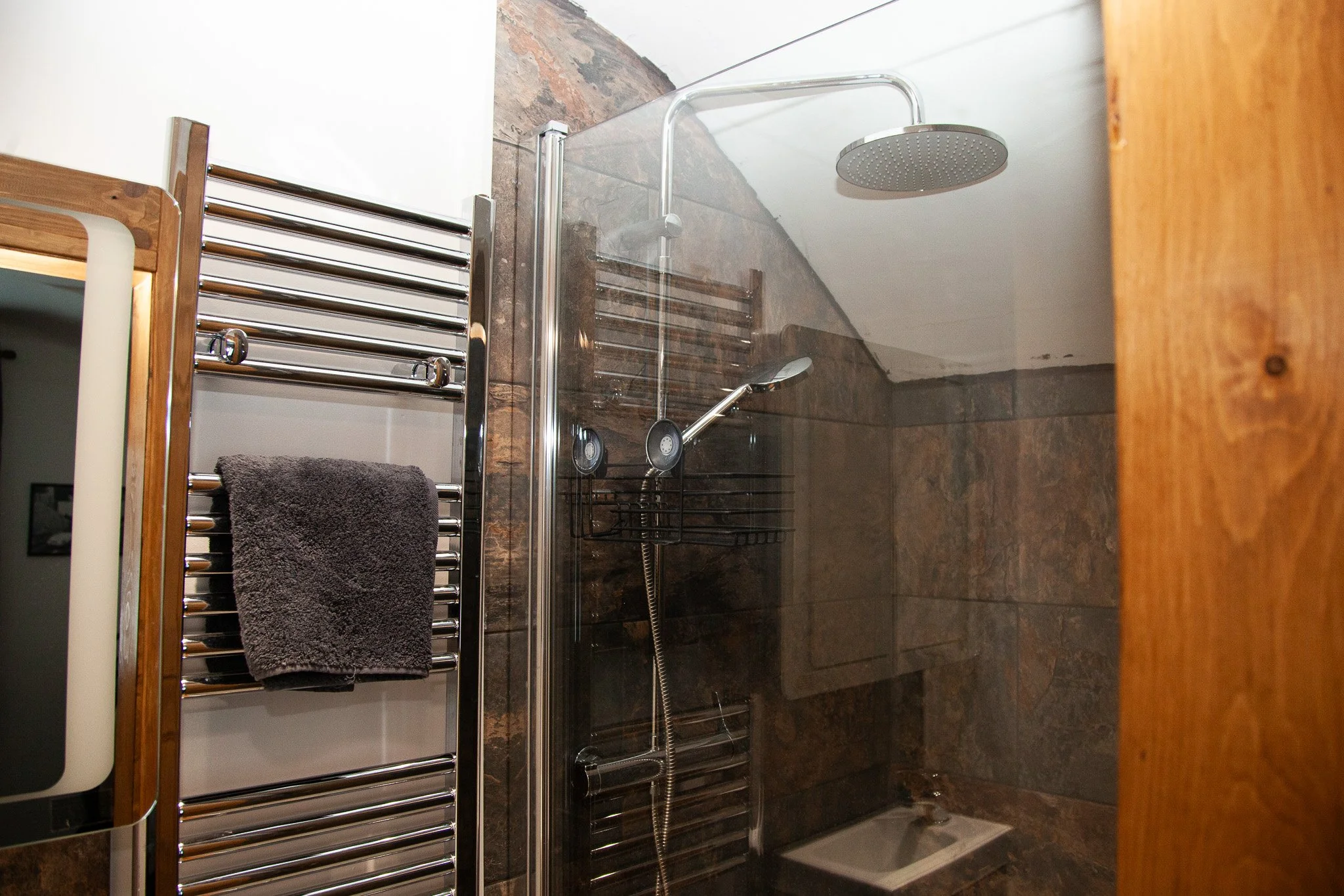 Family Bathroom between rooms 3 and 4 with roll top bath and large walk in monsoon shower.